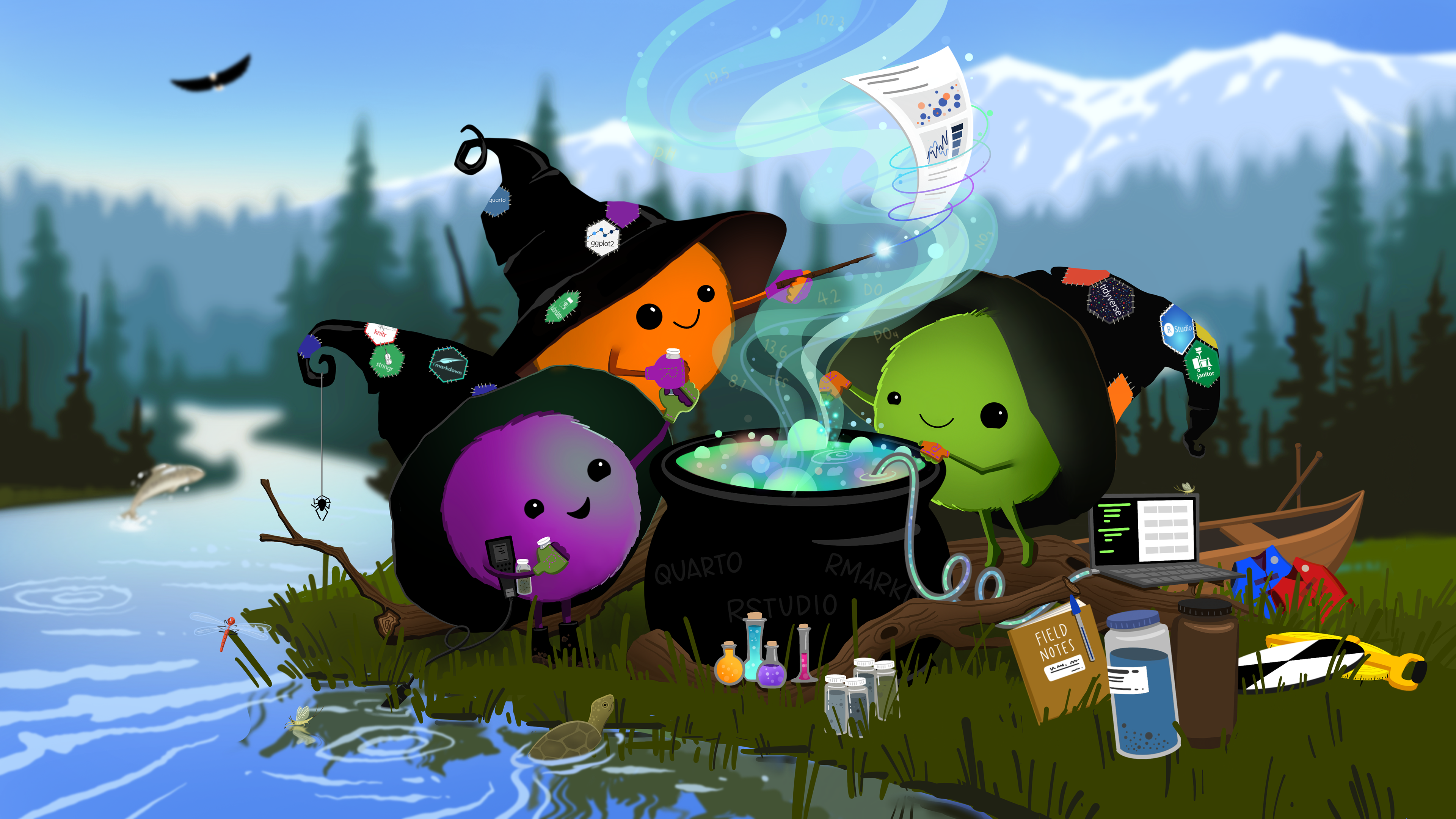 Three monsters in witch hats (covered in hex stickers for different R packages) work together to brew up a data science report on the banks of a wild river. They are surrounded by equipment for water quality measurements (like a Secchi disk, field journal, sampling bottles, and YSI). The background is a distant snow-covered mountain and pine trees. In the river alongside the witches are a curious turtle, mayflies, a jumping fish, and a dragonfly. Made with Angie Reed and Alena Reynolds for their 2024 Posit Conference Talk.