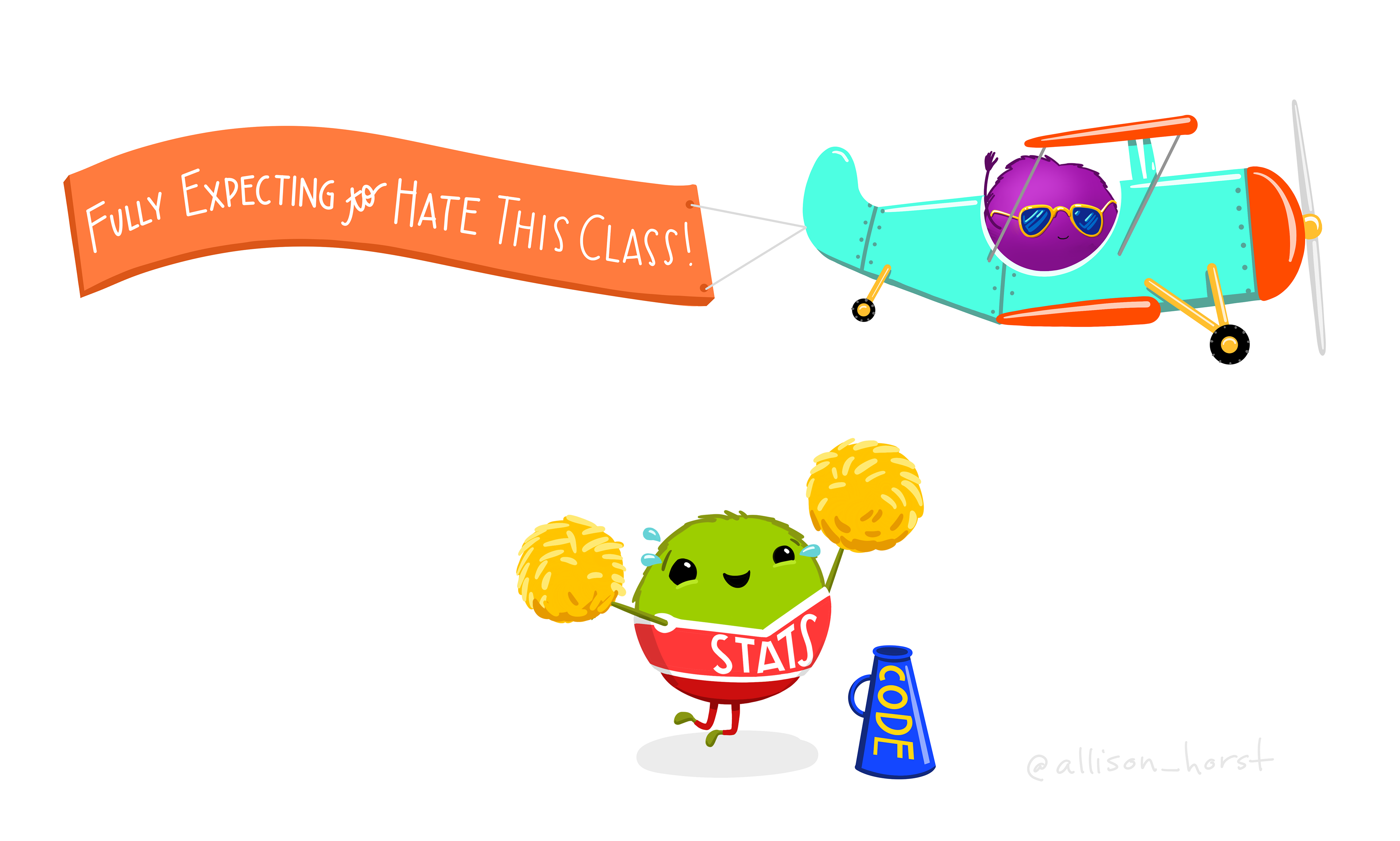 A little monster flying a biplane wearing aviator glasses, pulling a banner that says "Fully expecting to hate this class." Below, a teacher wearing a cheerleading outfit labeled "STATS" with a bullhorn labeled "CODE" cheering desperately with pom-poms, trying to help students believe stats is actually going to be awesomely life-changing.