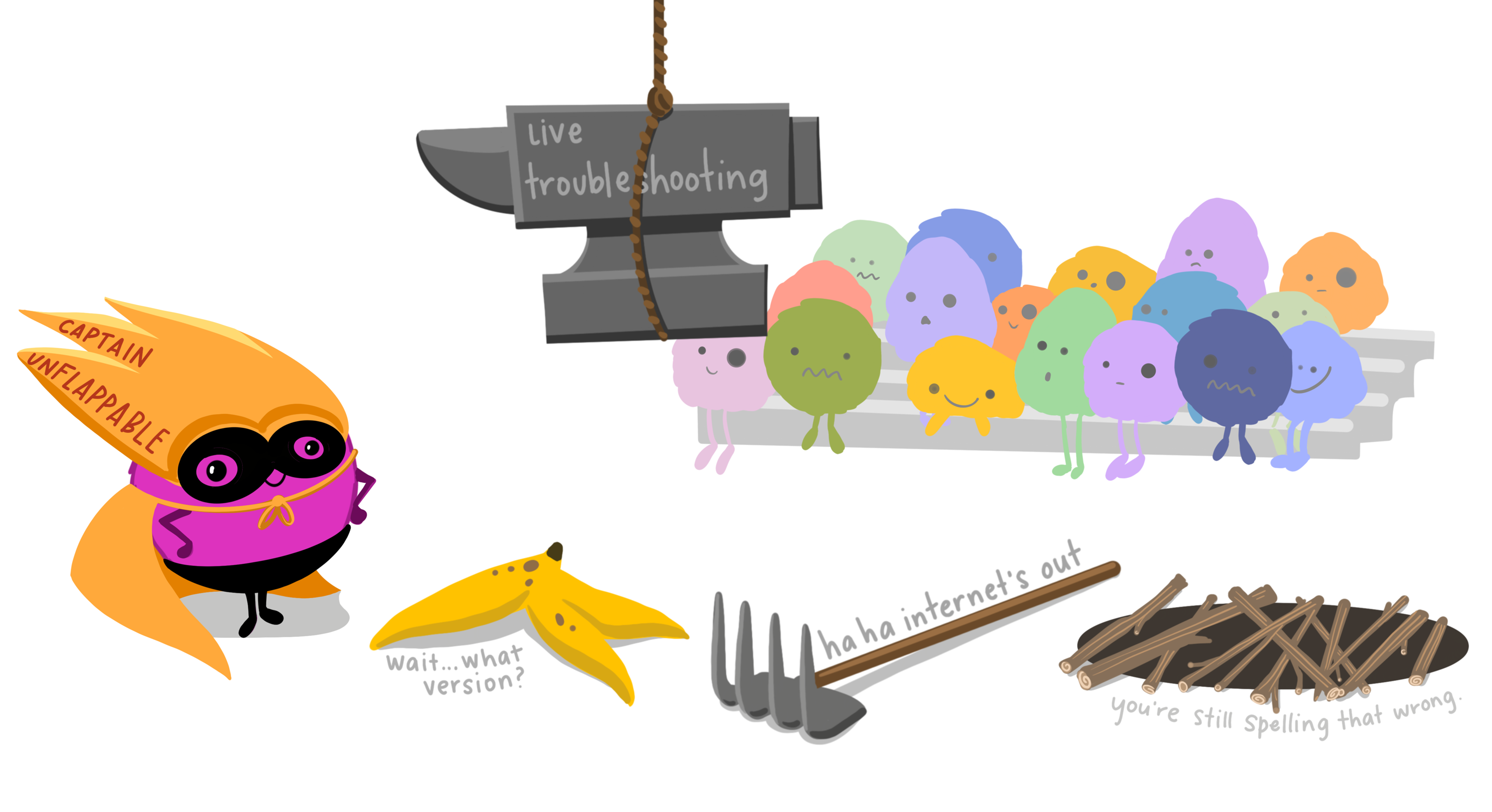 A person in a cape that reads “code hero” who looks like they are flying through the air while typing on a computer while saying “I’m doing a think all on my own!” The coder’s arms and legs have ropes attached to two hot air balloons lifting them up, with labels on the balloons including “teachers”, “bloggers”, “friends”, “developers”. Below the code hero, several people carry a trampoline with labels “support” and “community” that will catch them if they fall