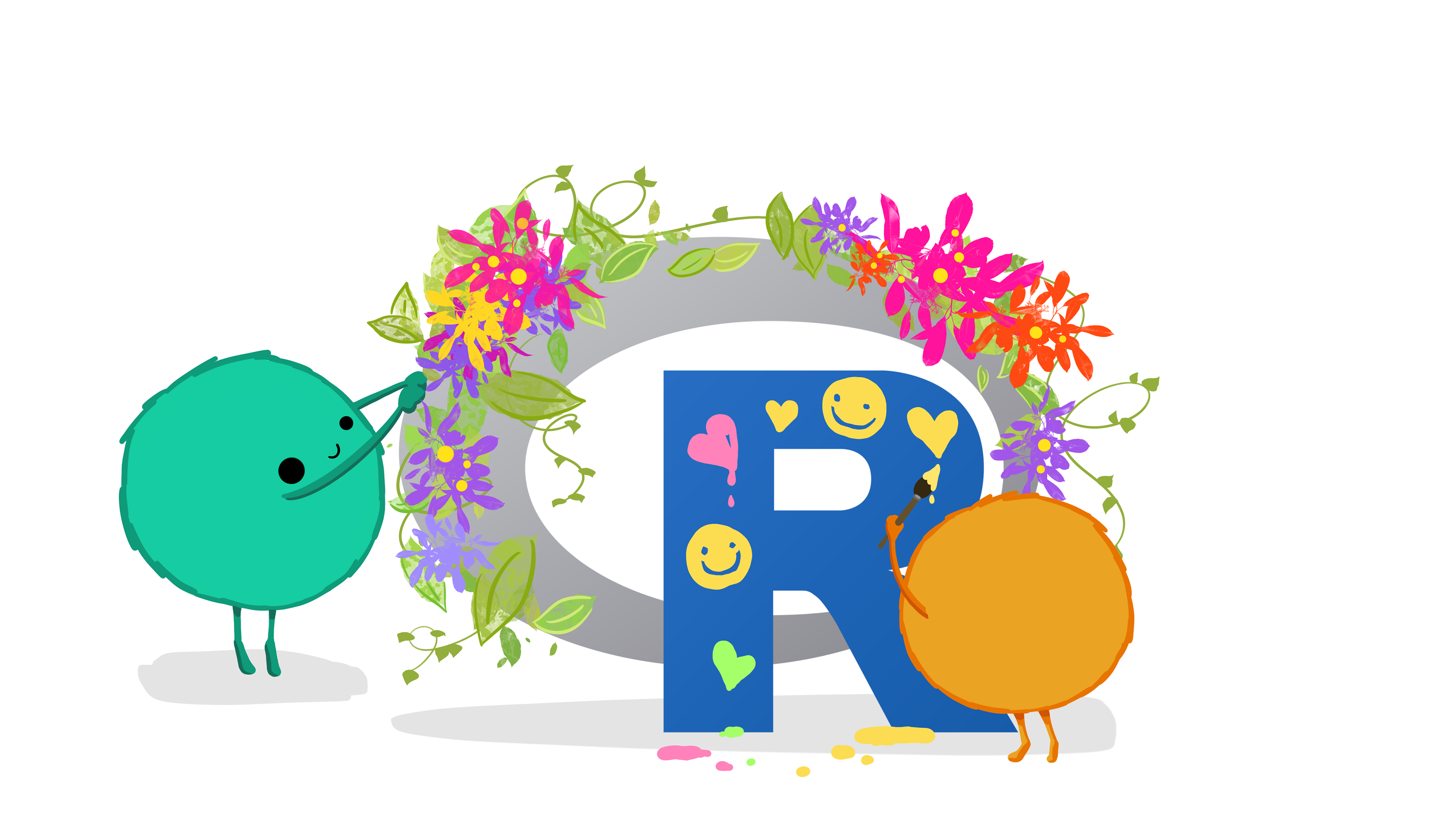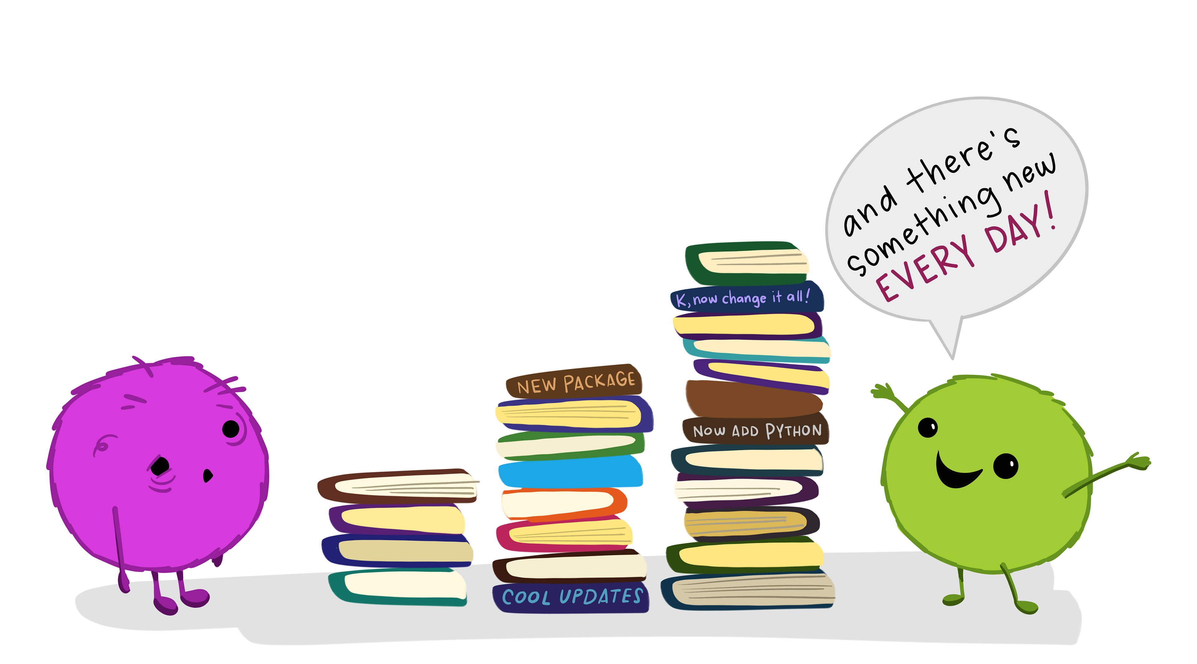 A digital cartoon with two illustrations: the top shows the R-logo with a scary face, and a small scared little fuzzy monster holding up a white flag in surrender while under a dark storm cloud. The text above says “at first I was like…” The lower cartoon is a friendly, smiling R-logo jumping up to give a happy fuzzy monster a high-five under a smiling sun and next to colorful flowers. The text above the bottom illustration reads “but now it’s like…”