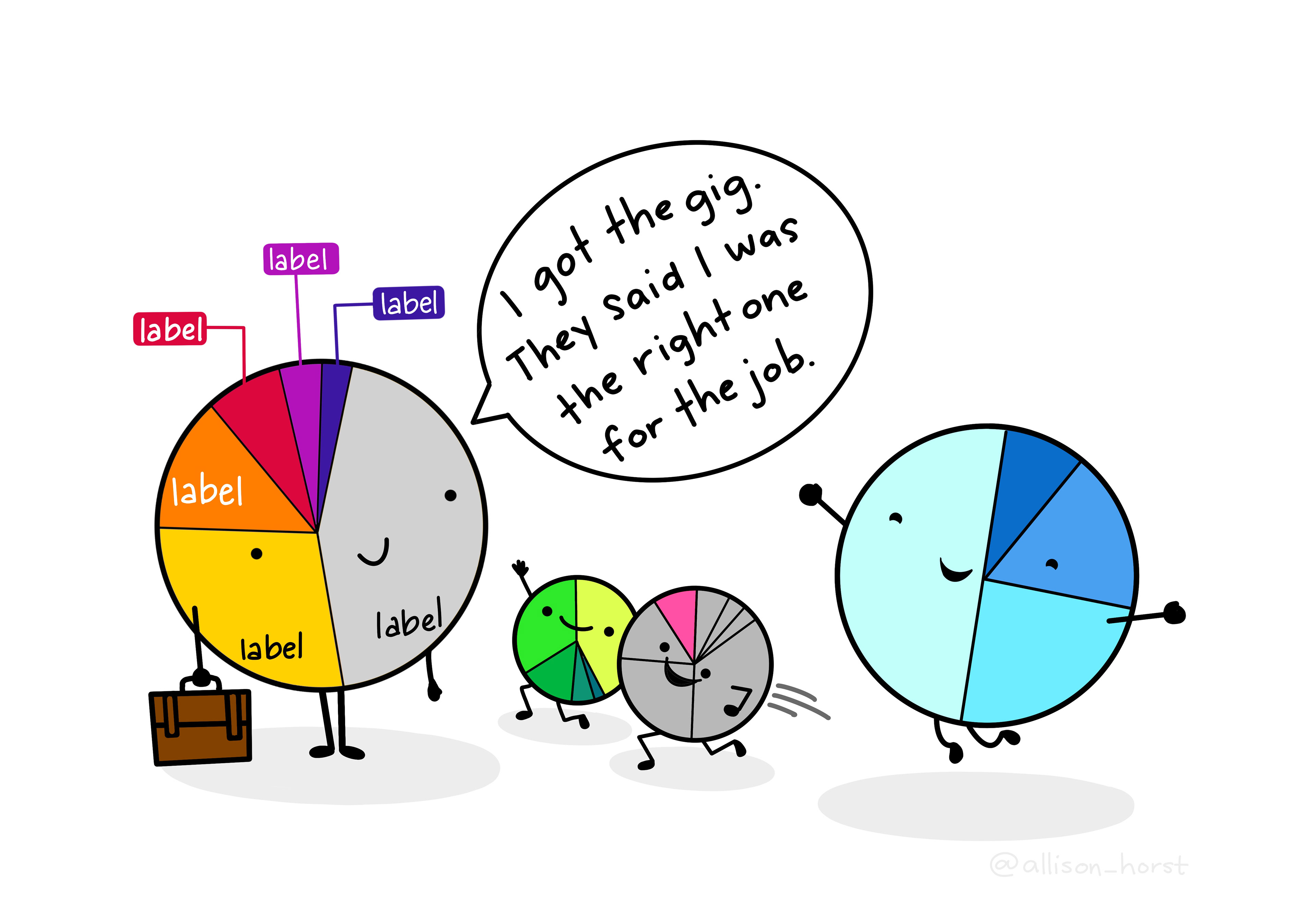 An adult pie chart holding a briefcase, coming home from a successful job interview. She says "I got the gig. They said I was the right one for the job." Her family (another adult pie chart and two pie chart children) come sprinting toward her, arms outstretched and looking elated.