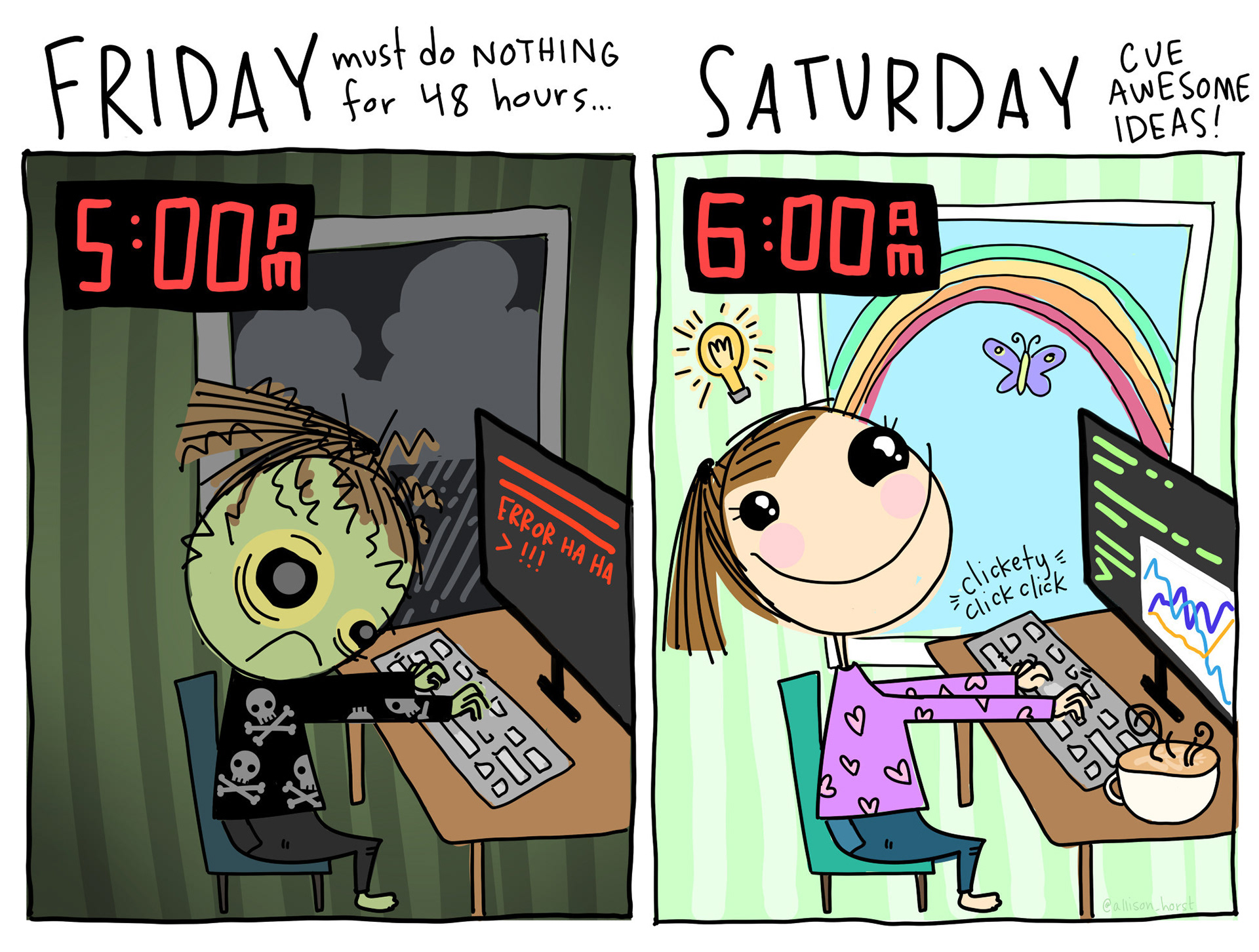 Cartoon split screen, on the left a demoralized zombified data scientist fails to write code at 5pm Friday, needing a serious break. On the right, they've woken up and look totally refreshed and happy at 6am on Saturday, the scene now looking delightful.