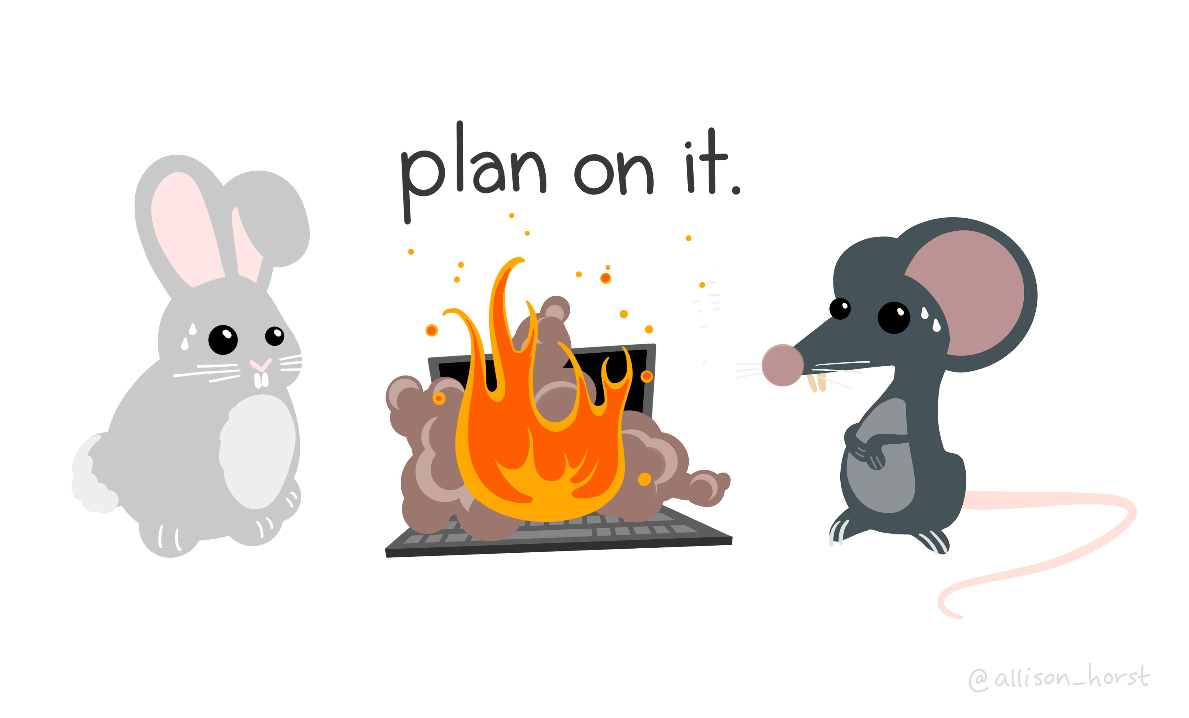 A bunny and a mouse, both looking stressed and sweaty, look on at a smoking laptop as flames start to grown from it. Text reads: "Plan on it."