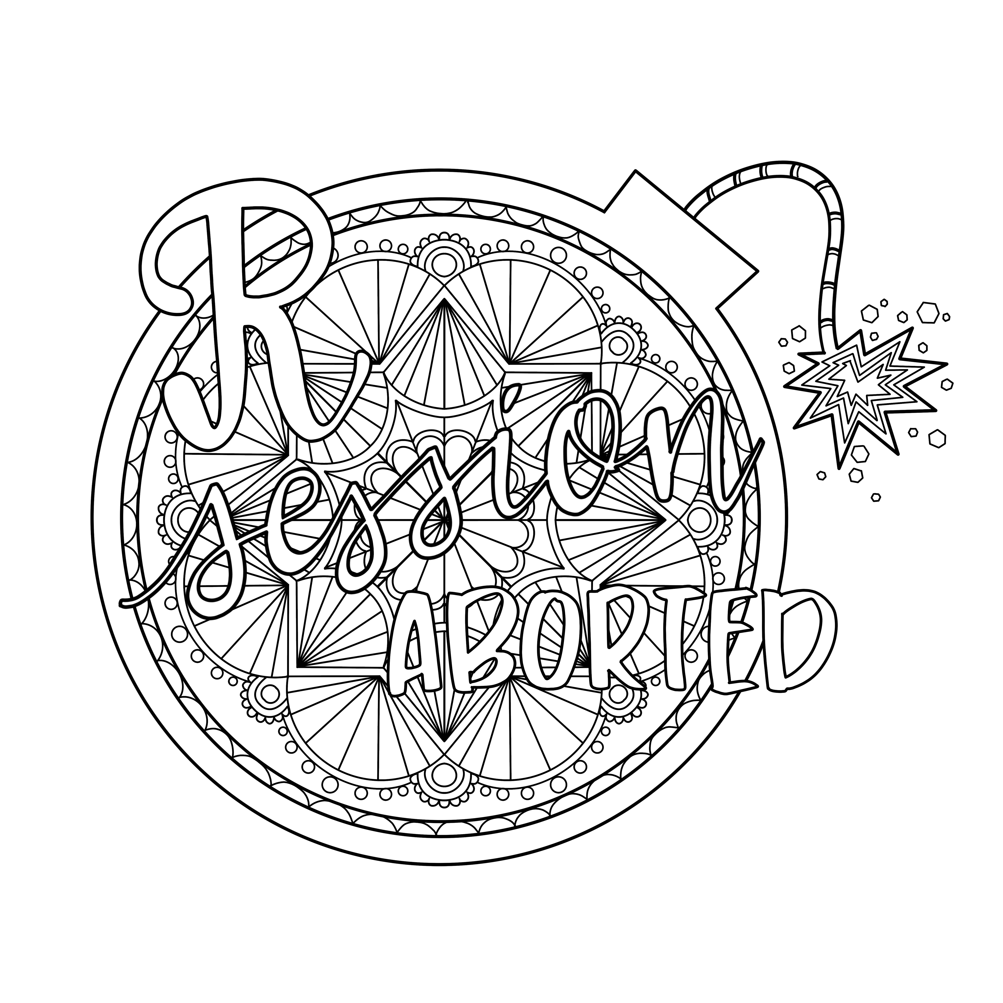 Coloring book illustration with text "R session aborted" on top of a bomb shape with lit fuse, with decorative designs and shapes within it.