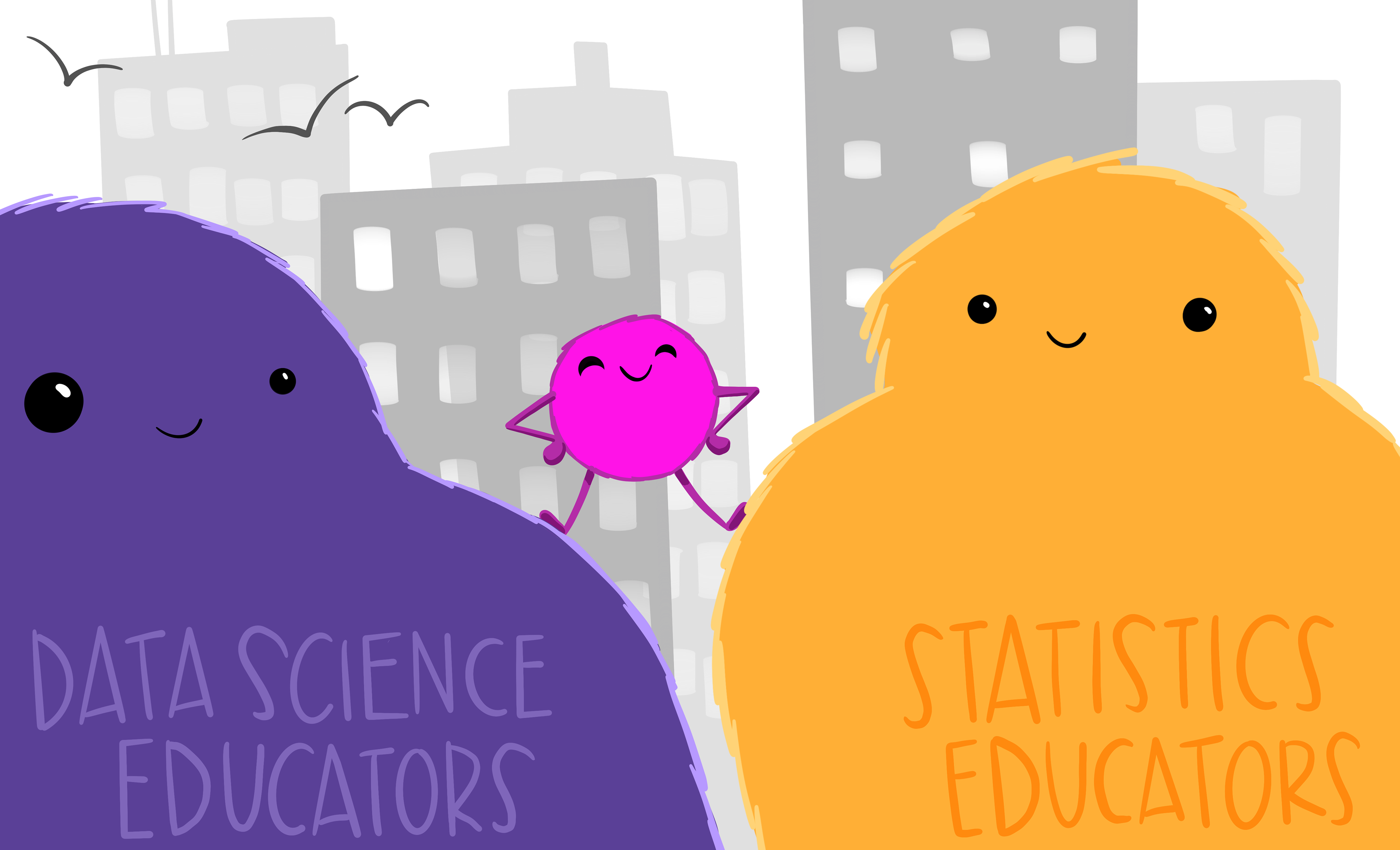 A small, proud looking monster standing on shoulders of two giant friendly looking monsters, with text that read "Data science educators" and "Statistics educators." Background is skyscrapers and seagulls flying.
