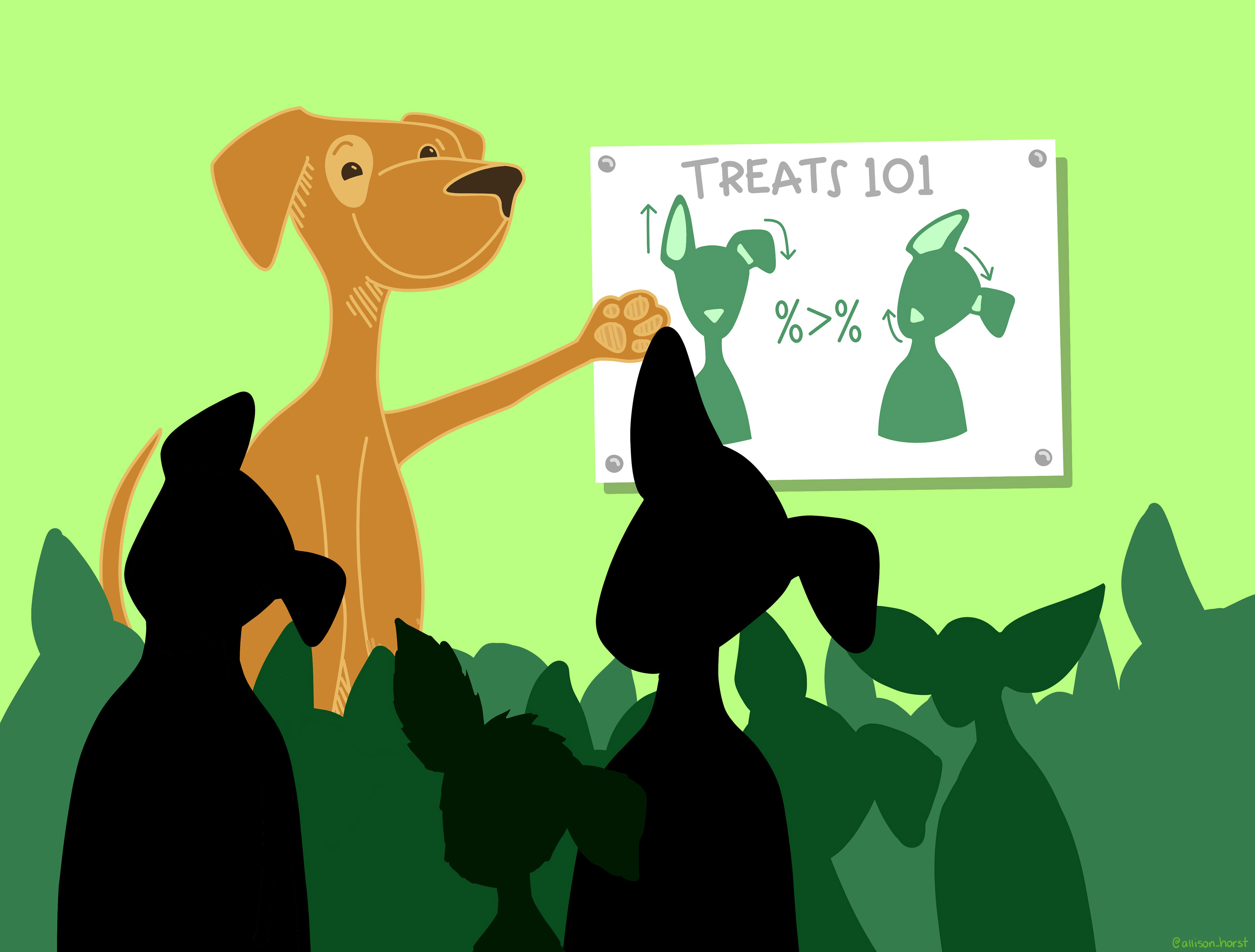 A cartoon dog teaches a group of other dogs how to beg for treats. On a sign they are pointing at is a picture of a dog, showing step 1: drop one ear, then (%>%) rotate your head for max cuteness.