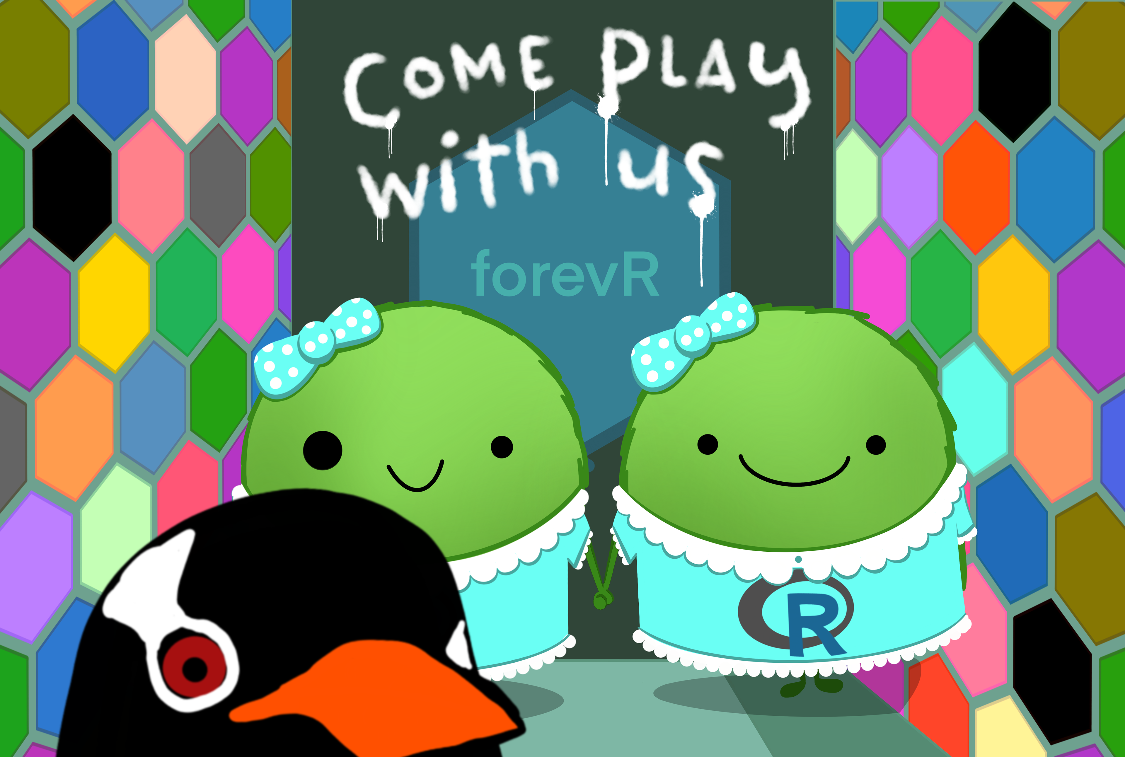Two smiling green monsters in matching blue dresses (like the scary twins in The Shining), standing in a hallway with hex wallpaper. Behind them is spraypaint-style text reading "come play with us" with "forevR" in a hex logo behind them. There is part of a penguin's face in the foreground (as if they are inspecting the camera).