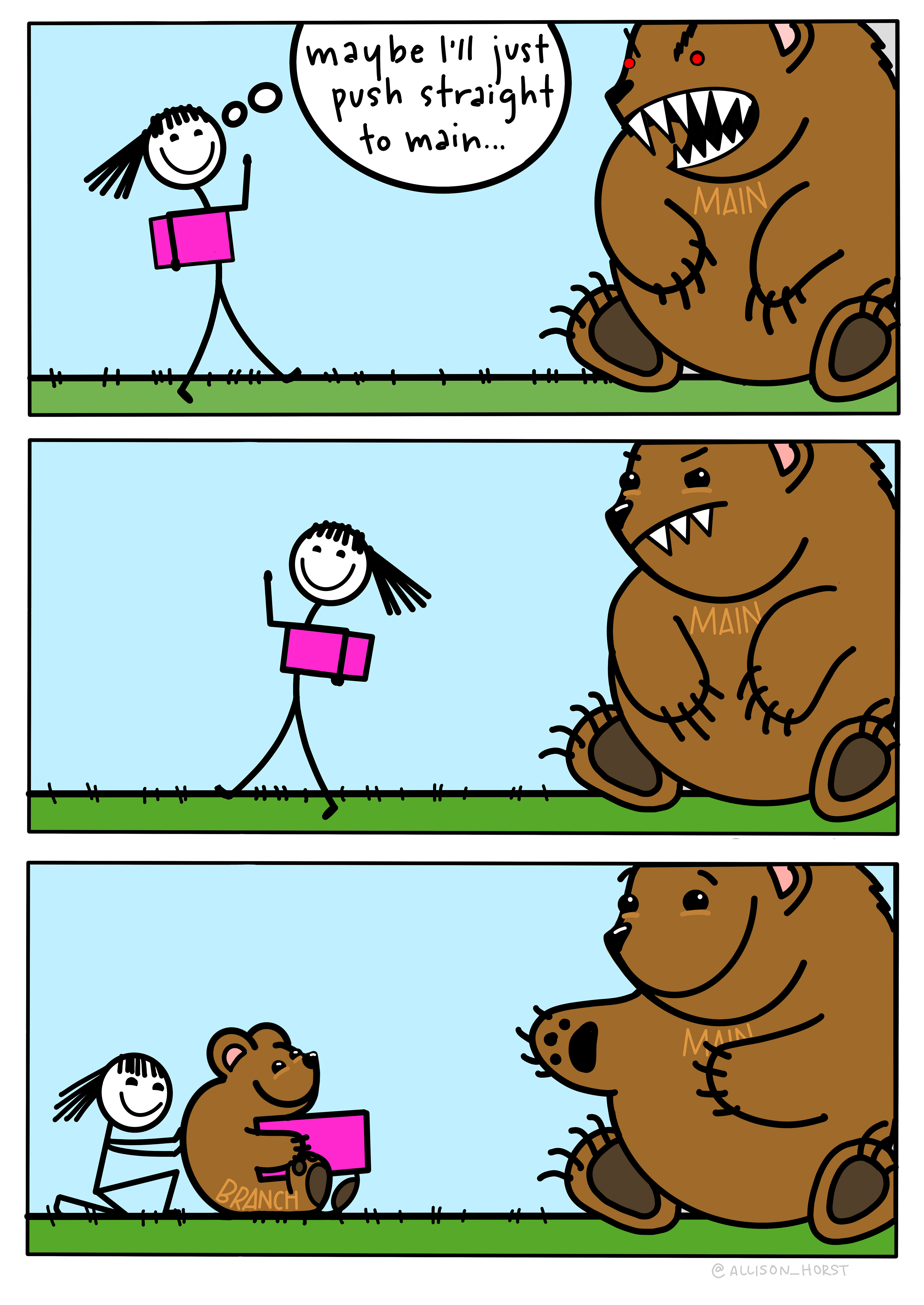 Lessons learned - work in a branch, don't make mama bear angry. A three panel cartoon. Top: a happy looking developer thinks "maybe I'll push straight to main" while carrying a package toward a bear labeled "MAIN" - but the bear is angry with red eyes and bared teeth. Middle: The same developer walking away, with the beer looking peeved as she leaves. Bottom: The developer pushes a baby bear (labeled BRANCH, who is now holding the package) toward the mama bear, as the mama bear MAIN looks lovingly at it with outstretched arms.