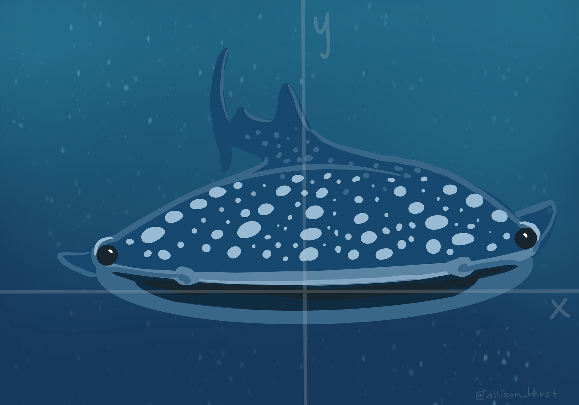 Illustration of a whale shark, with the face directly facing the viewer. There are subtle x and y axes overlaid onto the illustration. The whale shark’s oblong mouth is oriented horizontally along the x-axis. The whale shark looks friendly and has a slight smile on its face.
