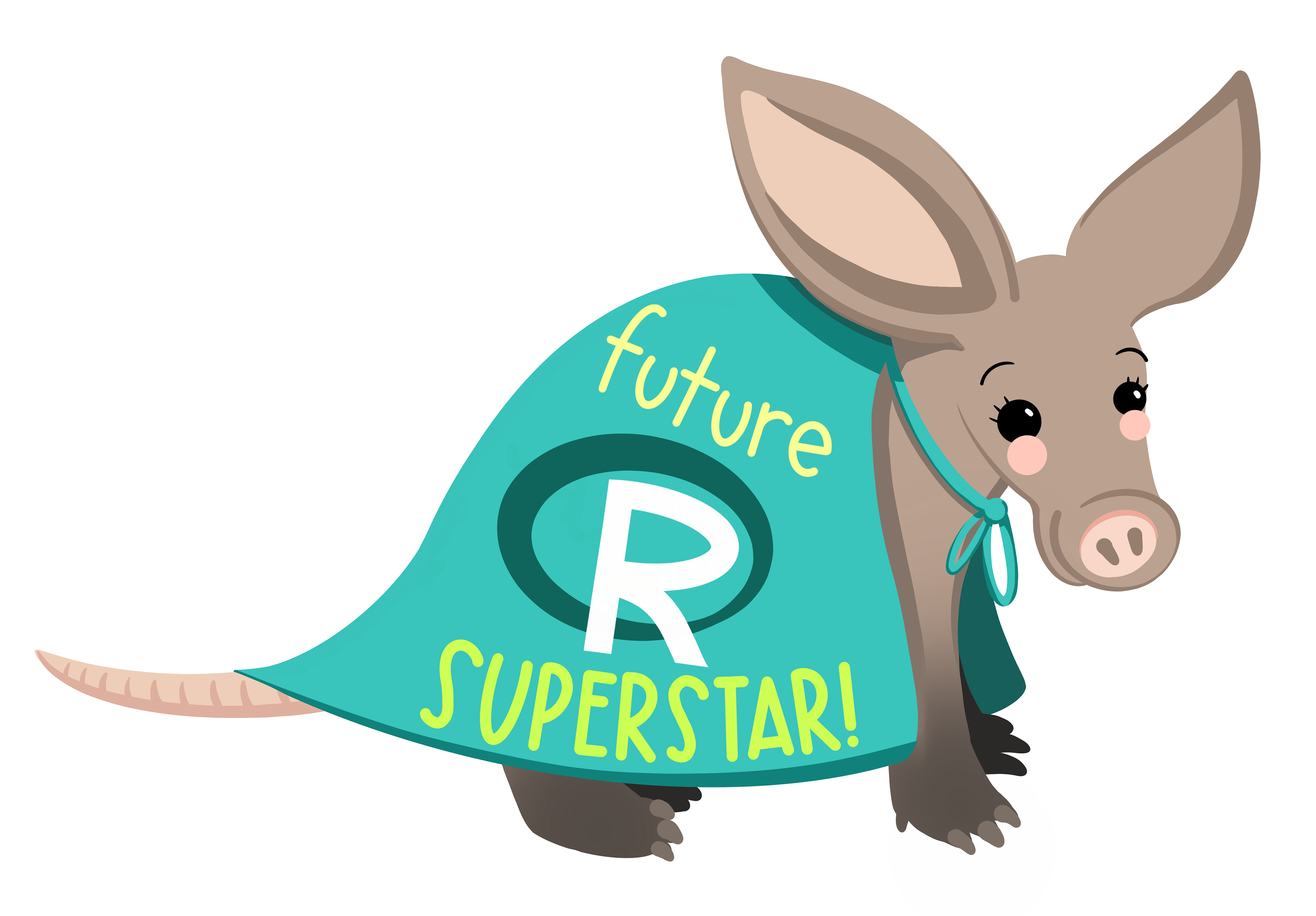 A collaboration with David Keyes: a yound R aardvark, wearing a cape with the words "future R superstar" on it. Printed onto a onesie for a friends' baby.