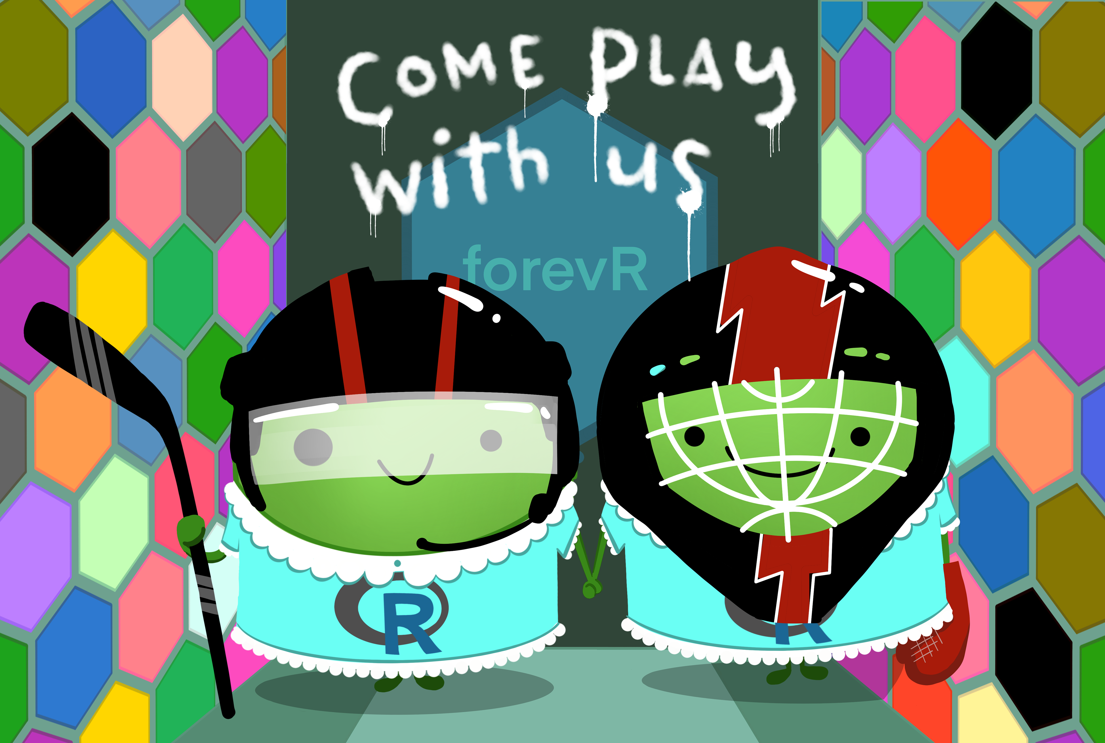 Two smiling green monsters in matching blue dresses (like the scary twins in The Shining) and wearing hockey helmets and gear, standing in a hallway with hex wallpaper. Behind them is spraypaint-style text reading "come play with us" with "forevR" in a hex logo behind them.