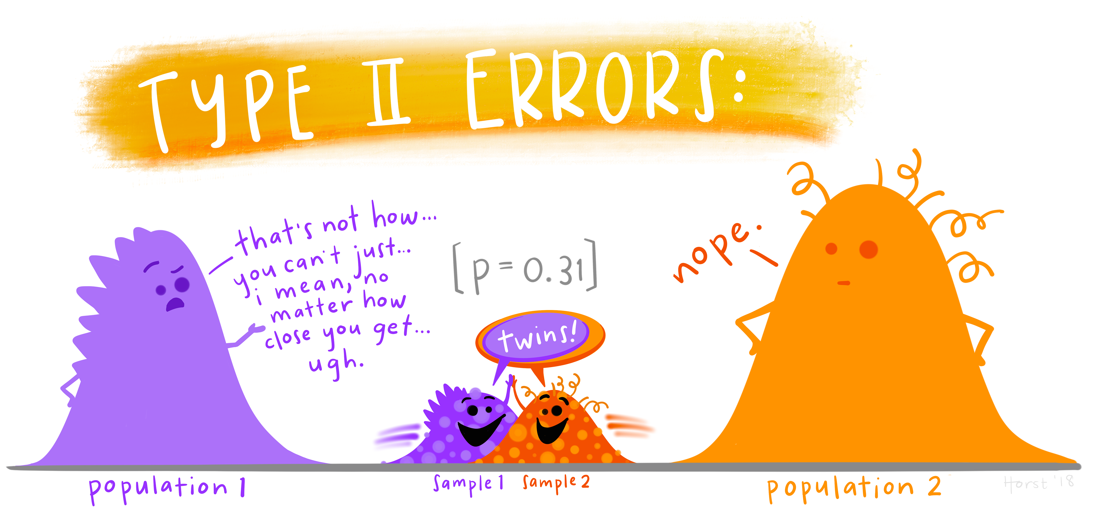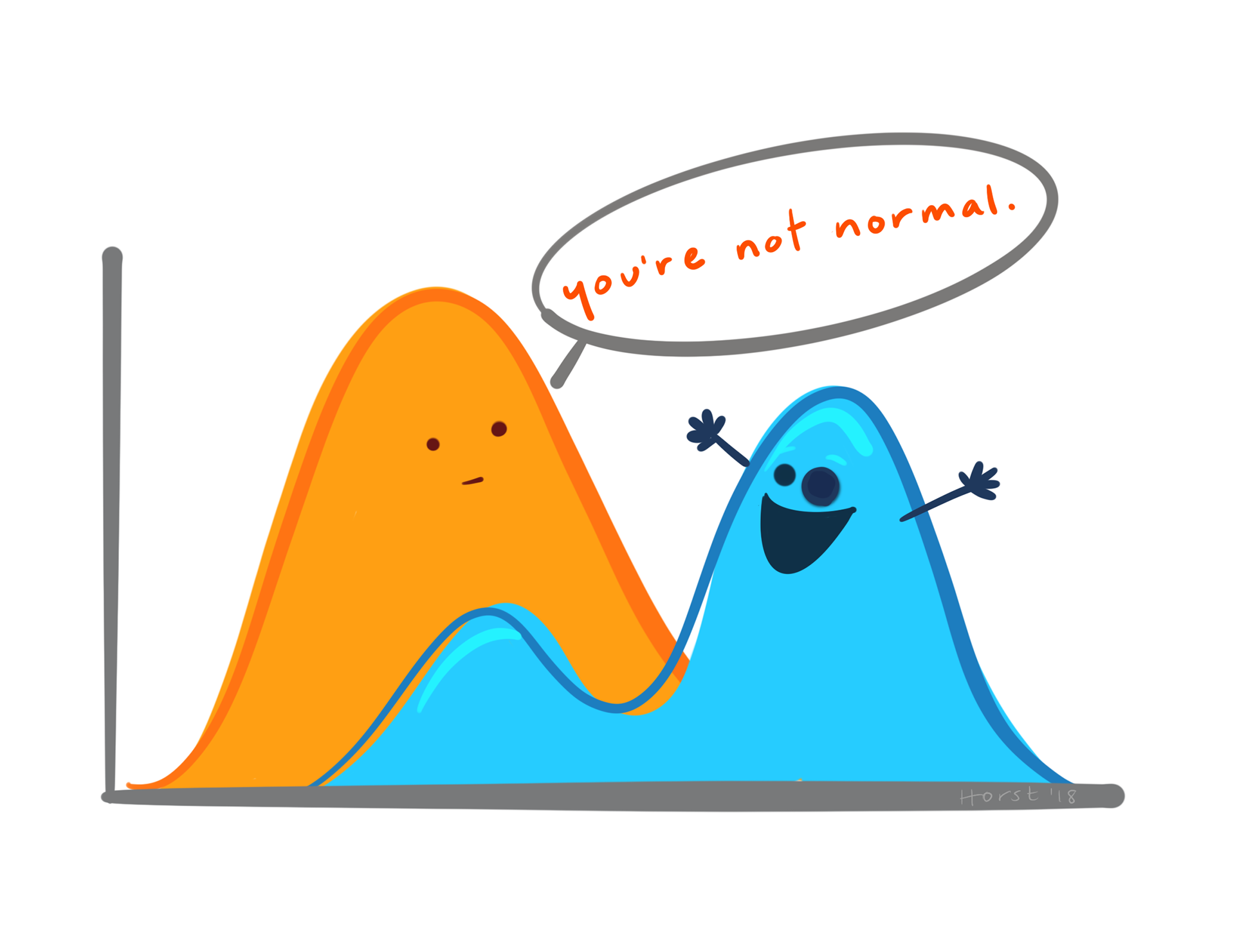 Cartoon of a normal distribution looking skeptically at an excited looking bimodal / negatively skewed distribution. The first says to the second, "you're not normal."