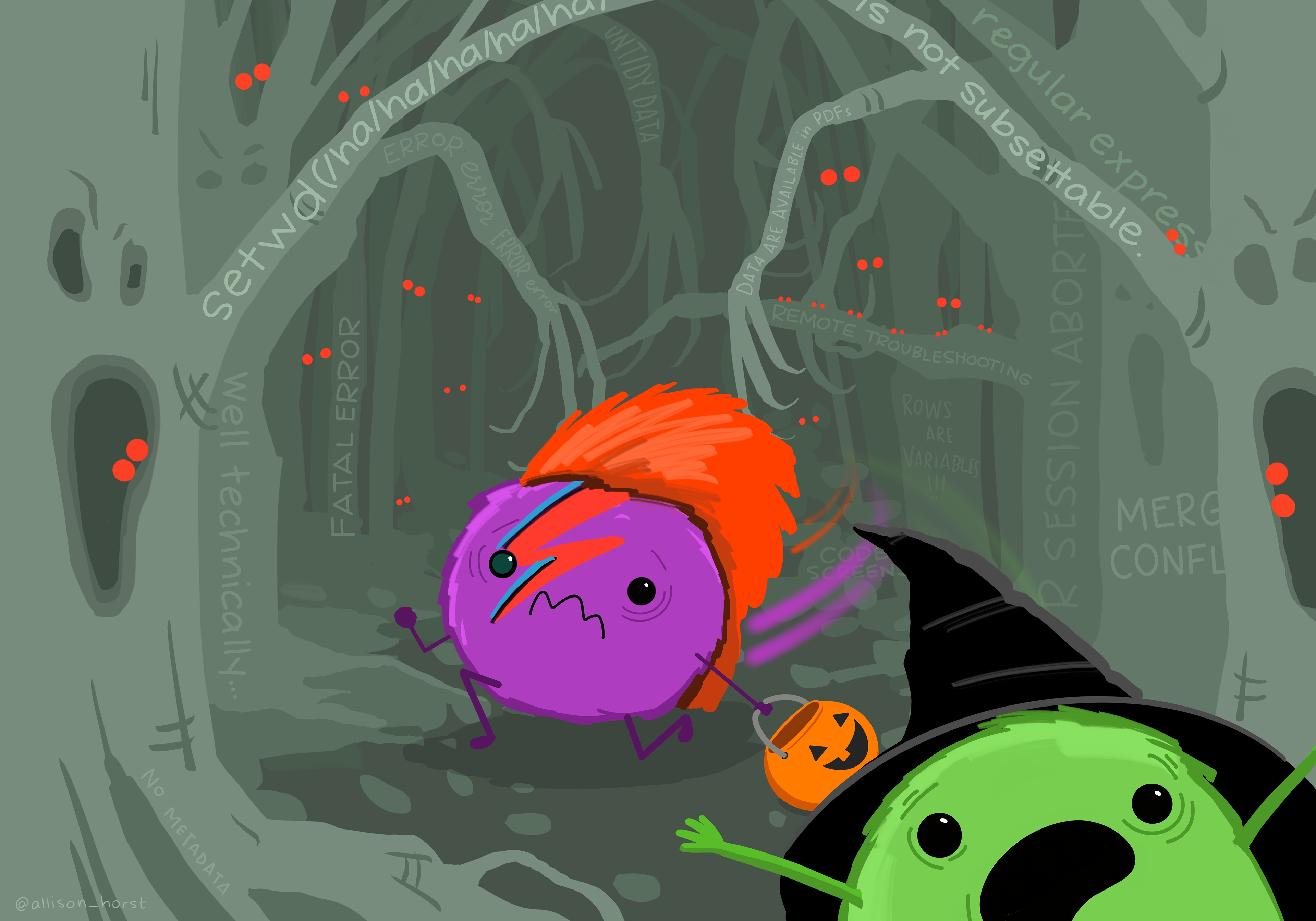 Two small monsters, one dressed as David Bowie (with facepaint lightning and a red wig, holding a jack-o-lantern shaped trick-or-treat tote) and the other wearing a witch hat, run in a panic toward the viewer out of a haunted forest. Creepy surrounding trees with glowing eyes in them have text on branches including ("well, technically...", "FATAL ERROR," "R Session Aborted," "Merge Conflict," "Data are available in PDF," "No metadata," "Untidy data" and more.