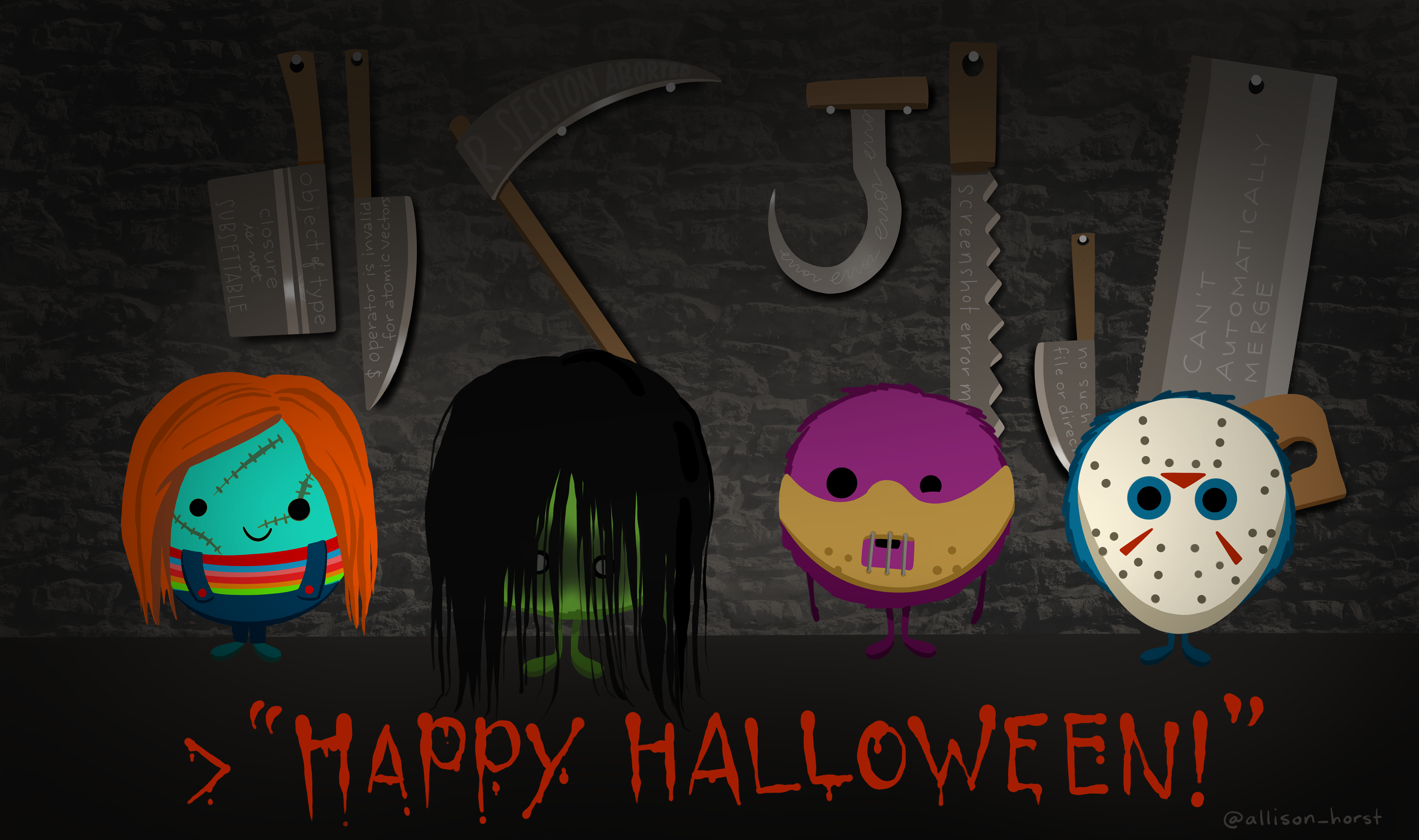 Small fuzzy R monsters in costume as famous villains from horror movies. Left to right: Chucky (wearing a wig, rainbow shirt and overalls, with stitches on its face), the girl from The Ring (black long hair over face), Hannibal Lecter (masked with bars in front of mouth), and Jason (iconic hockey mask). On the wall behind them are different menacing tools (butcher knives, saws, scythe) with scary things on them, e.g. "Can't automatically merge," "screenshot error message," "no such file or directory", "$ operator is invalid for atomic vectors."