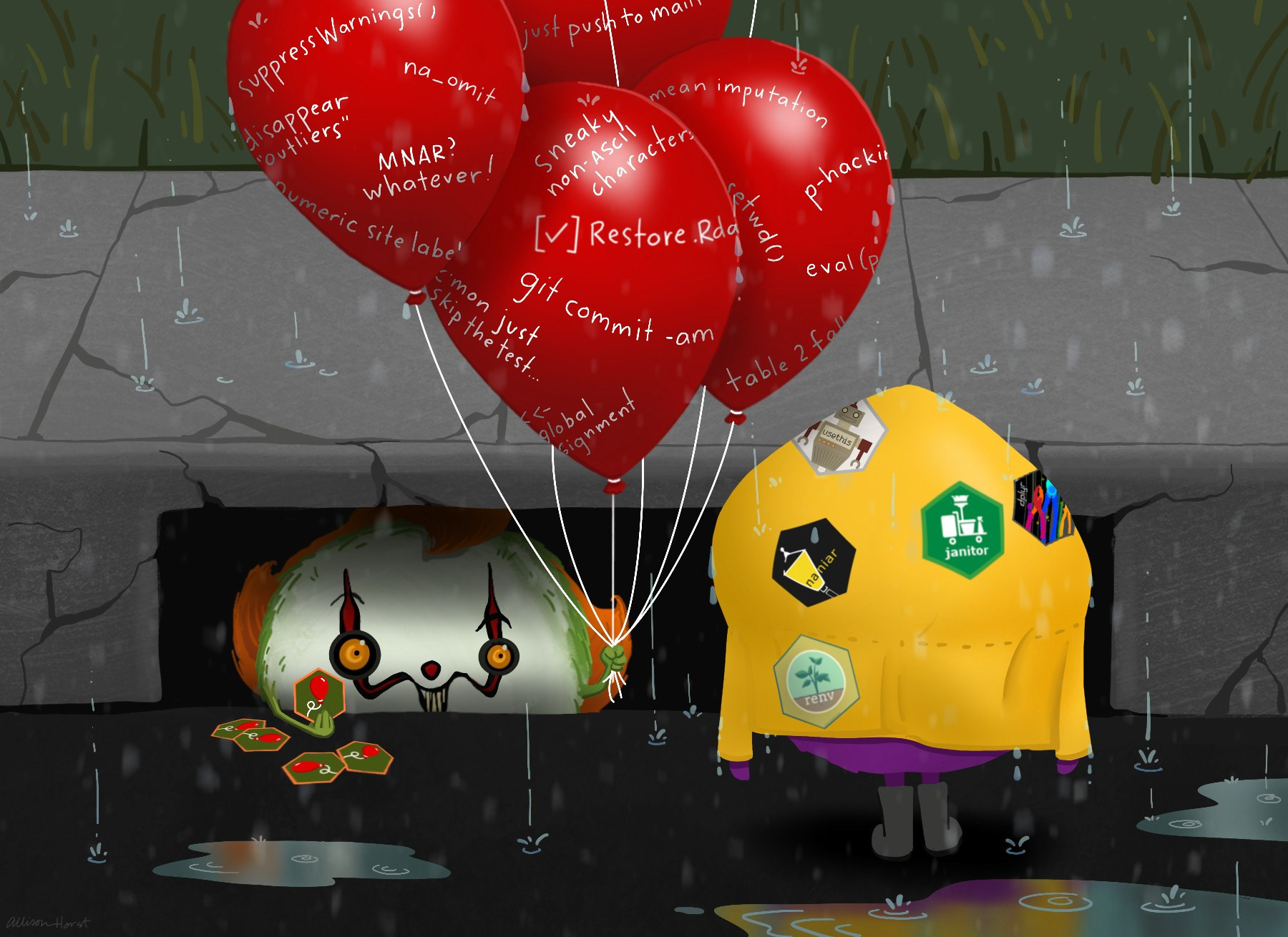 An illustration recreating the It movie poster, where a monster version of Pennywise peers out of a storm drain holding red balloons and hex stickers, enticing a little monster in a yellow raincoat who looks on. On the balloons are written different things to be cautious about in R / stats. On the raincoat are different hex stickers (for janitor, naniar, usethis, dplyr, renv...).