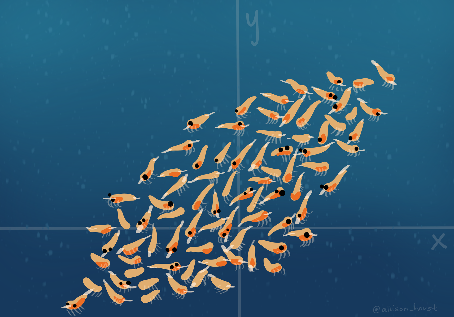 A swarm of illustrated krill in an oblong shape extending from the lower left corner upward toward the top right corner. The longest axis of the krill swarm at about a 45 degree angle. A subtle x and y axis are overlaid onto the krill swarm.