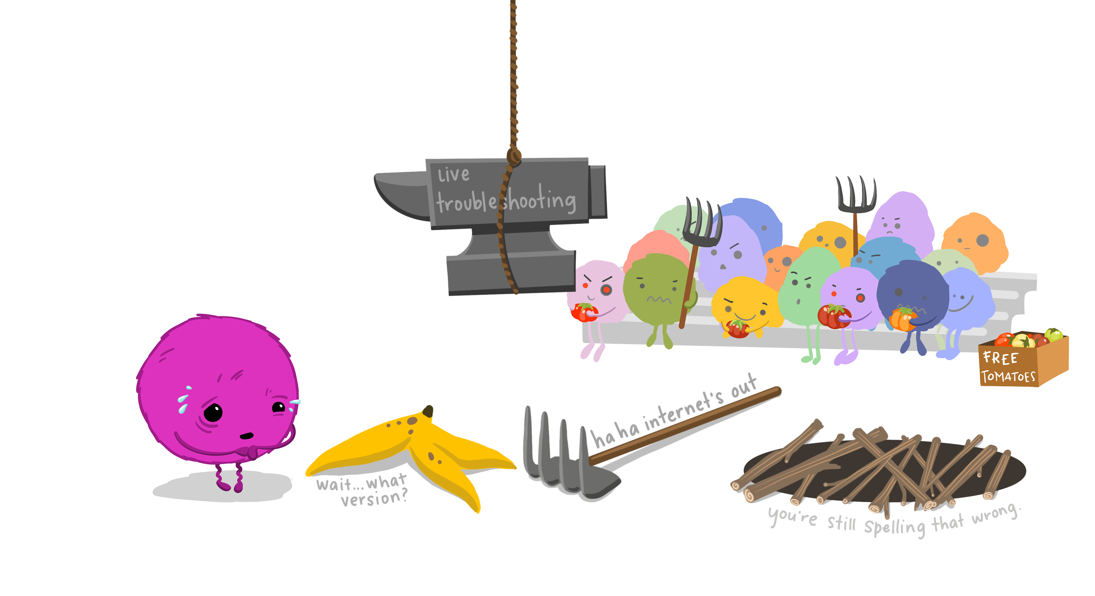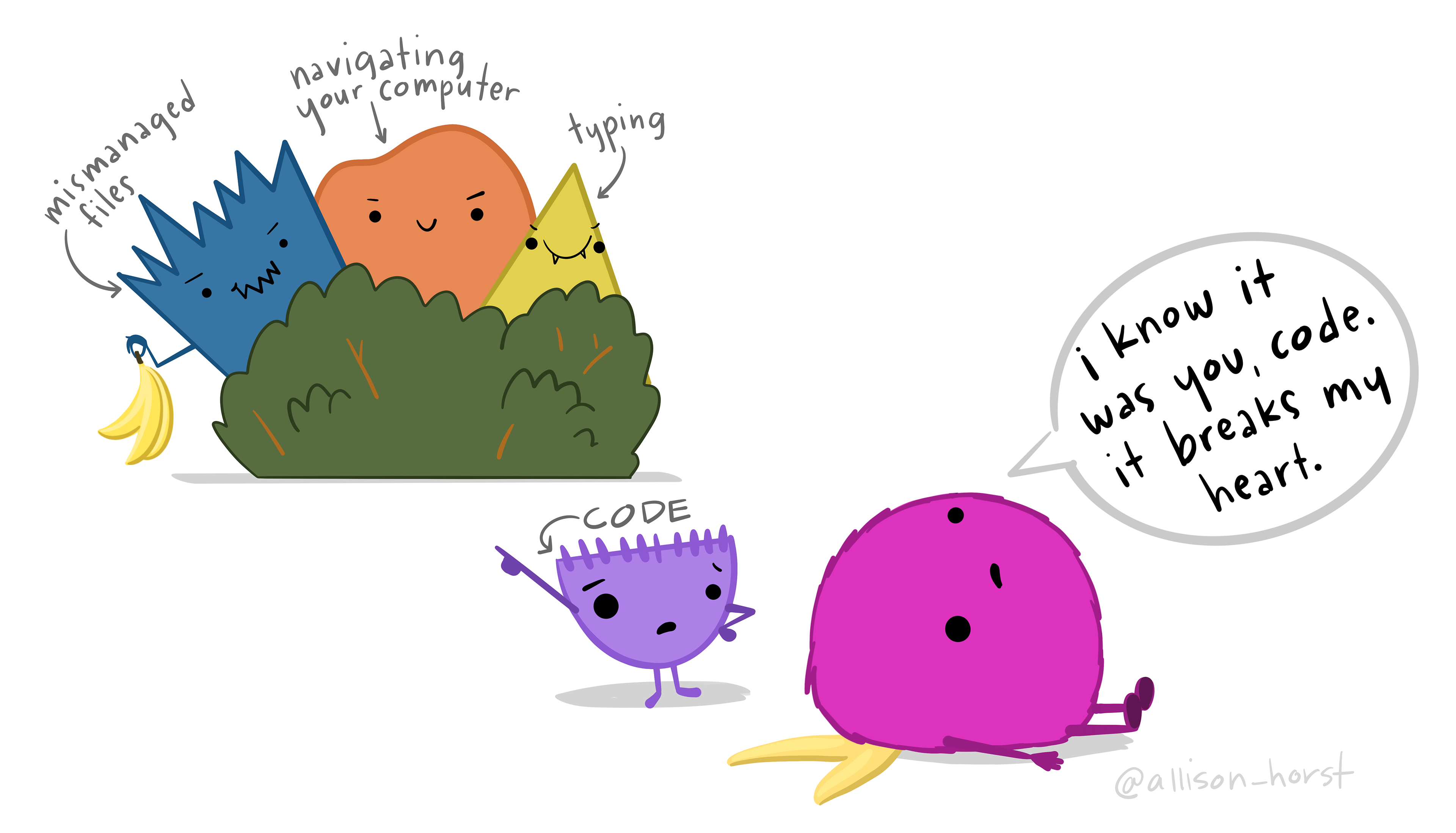 A friendly monster has slipped on a banana peel, and says "I know it was you, code. It breaks my heart." Meanwhile, a little character labeled "CODE" looks on indignantly, pointing to evil characters labeled "mismanaged files," "navigating your computer", and "typing" hiding behind a bush holding a bunch of bananas. The point being: often folks blame code for data science problems that are often caused by other underlying issues.