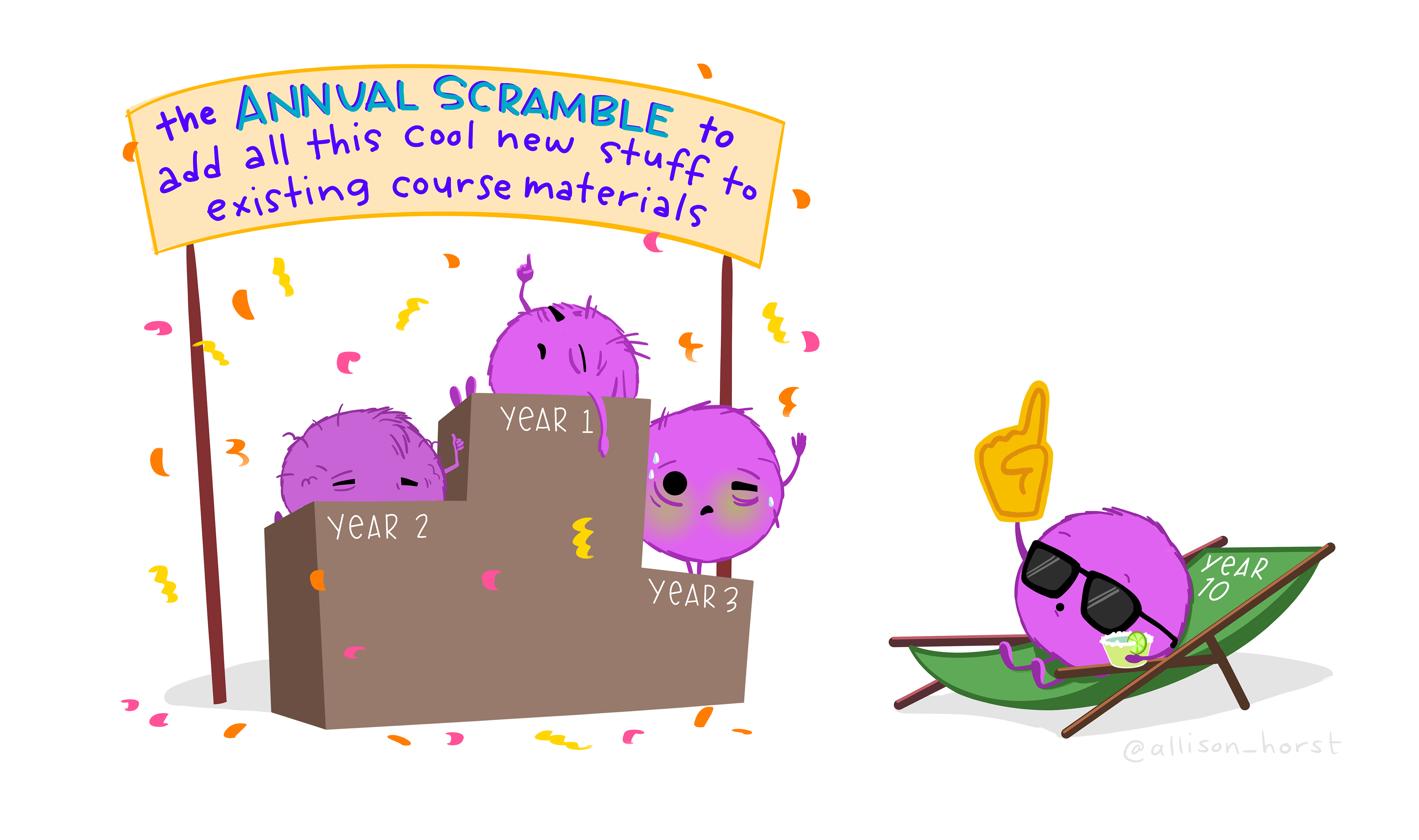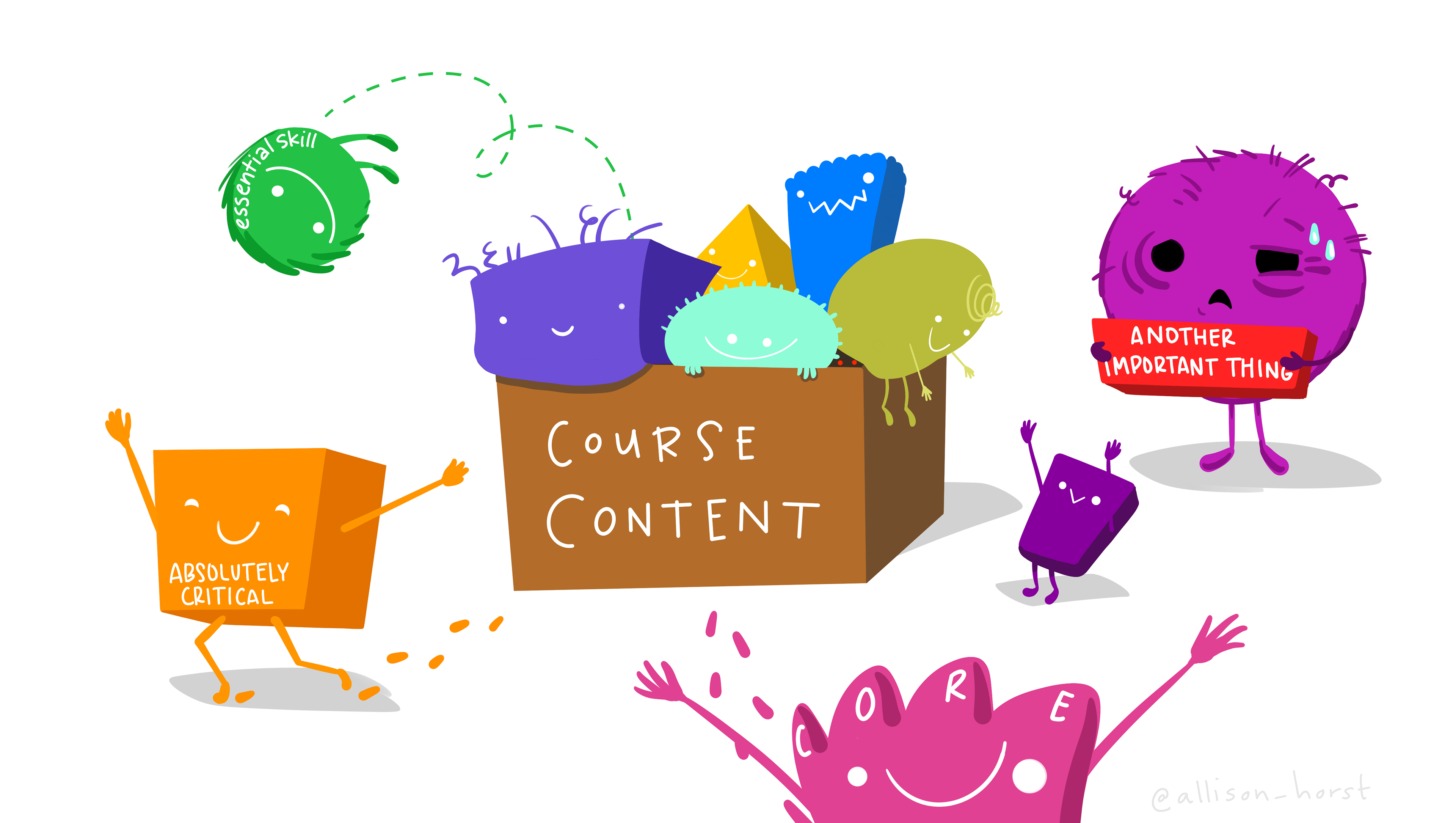 An exasperated teacher holding a box that says "Another important thing" walks towards a box labeled "course content", where different unruly topics labeled "essential", "core" etc. are leaping out and running away.
