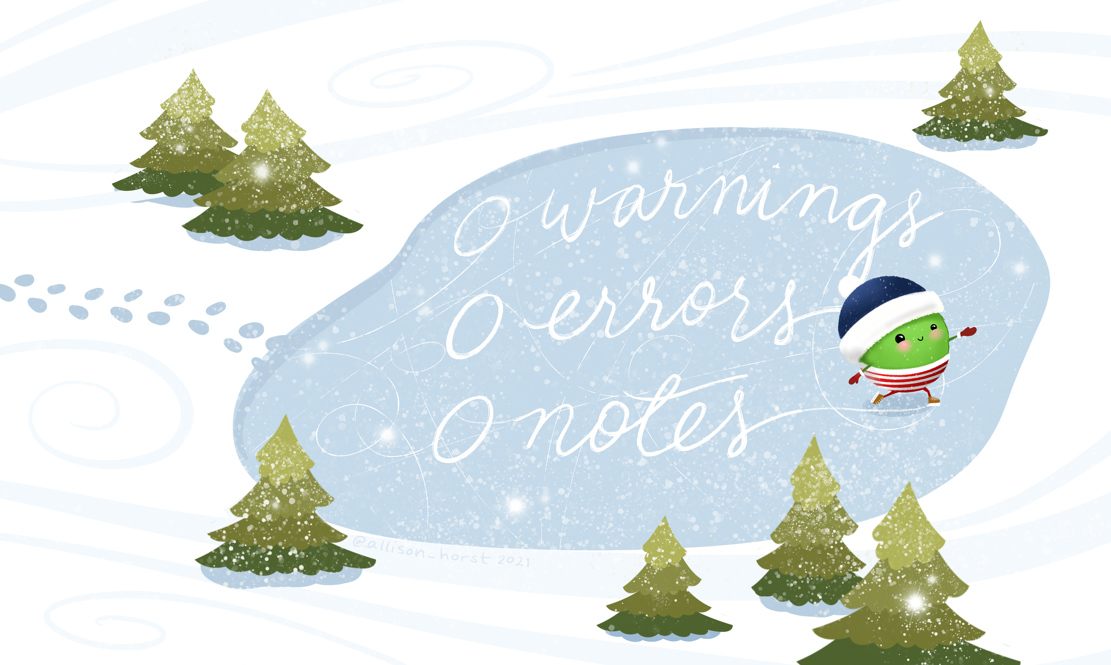 A cute round monster, smiling while skating on a frozen pond in a winter snowscape with frosty pine trees. The skate tracks reveal what developers hope for in package checks: "0 warnings, 0 errors, 0 notes."