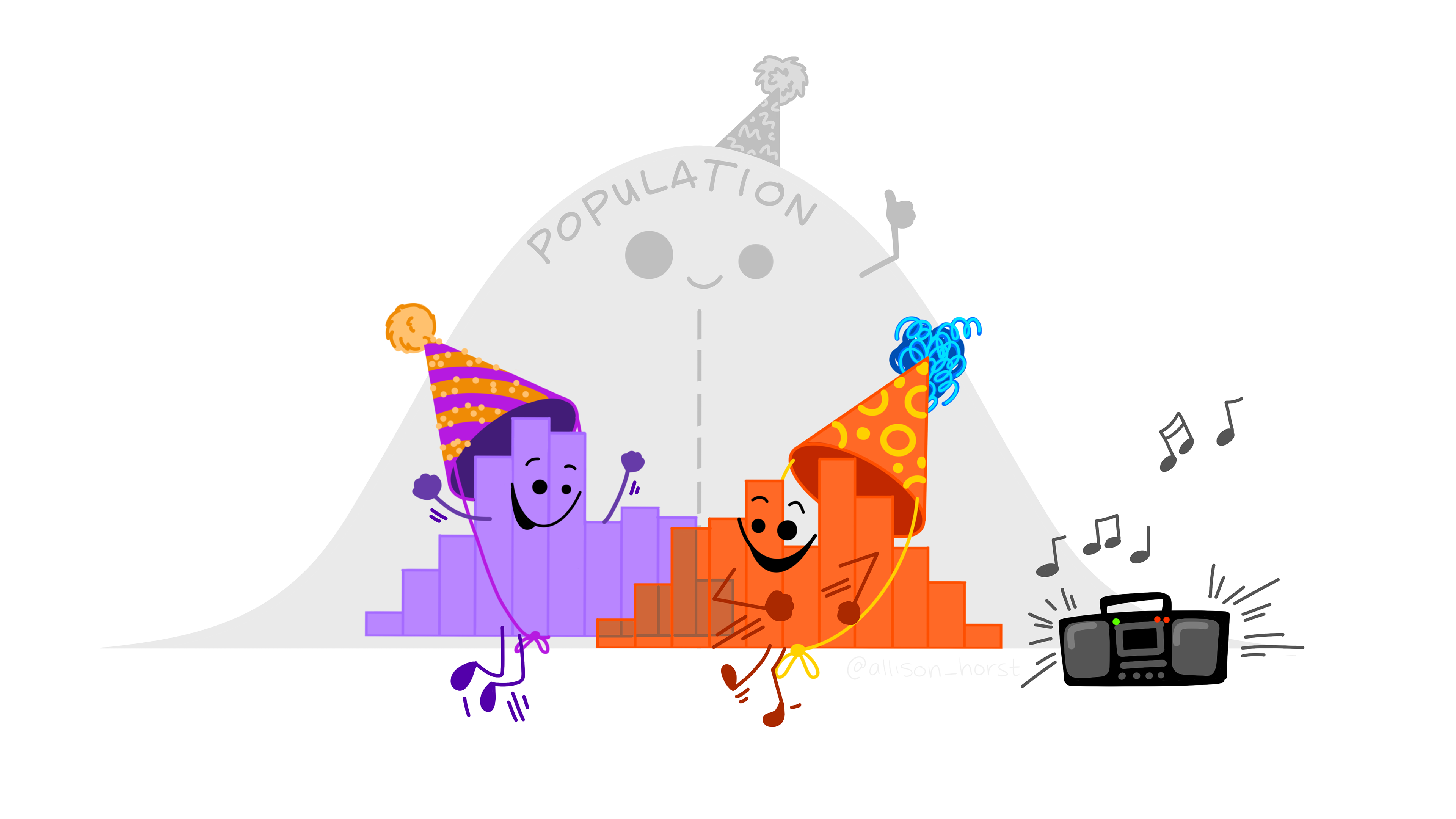 Main text: "Are your summary statistics hiding something?" On the left is a opaque gray bar plot with an error bar, looking mischievous while hiding individual data points in a net behind it. On the right is a transparent bar plot with an error bar, looking exposed, with individual data points exposed and dancing. The bottom four data points have arms that spell "YMCA" as if dancing to the Village People.