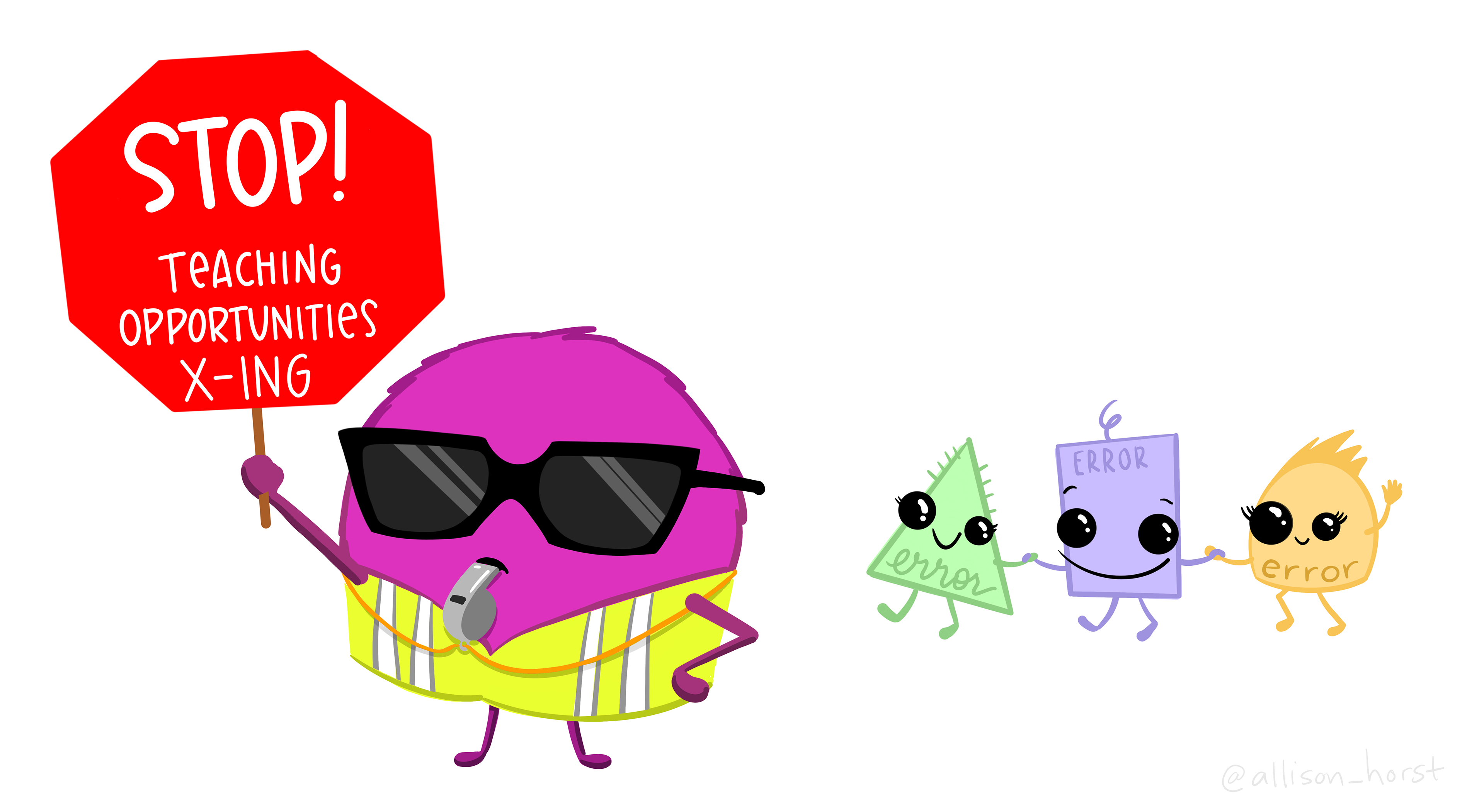 A cartoon fuzzy monster crossing guard holding a stop sign reading "STOP! Learning opportunities crossing," in front of a little parade of cute monsters representing errors.