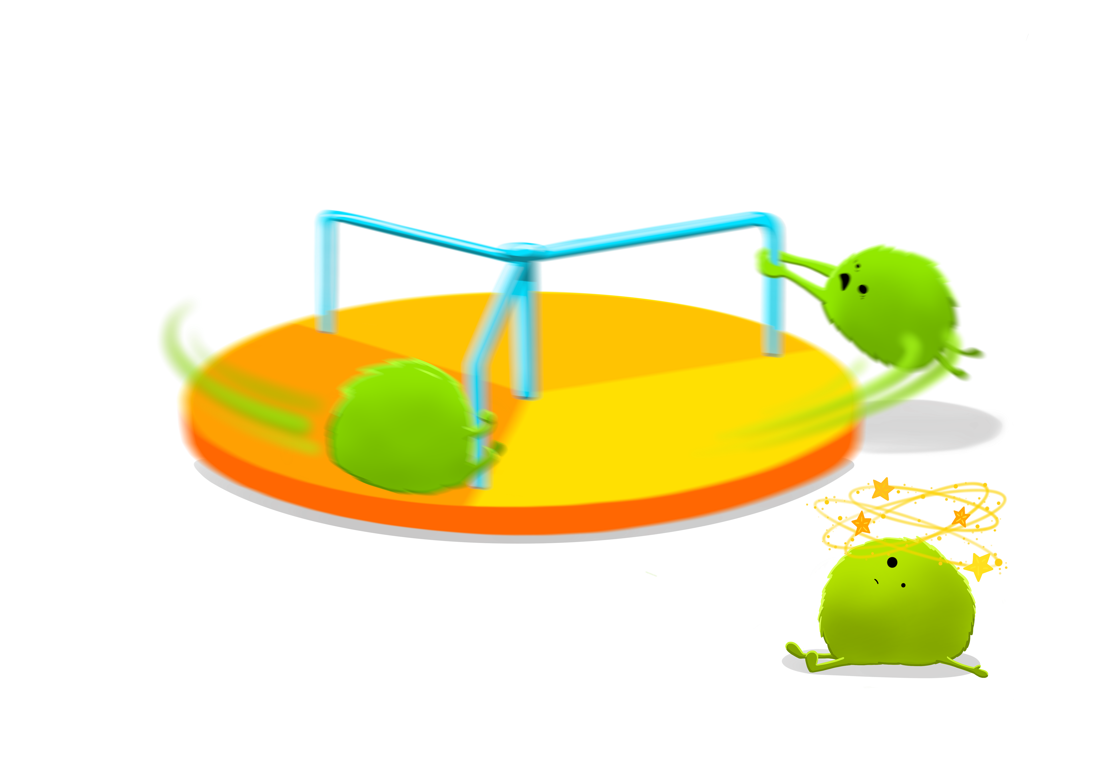 Three green fuzzy monsters being whipped around on a spinning park platform, with one that’s already been flung on the ground looking dizzy.